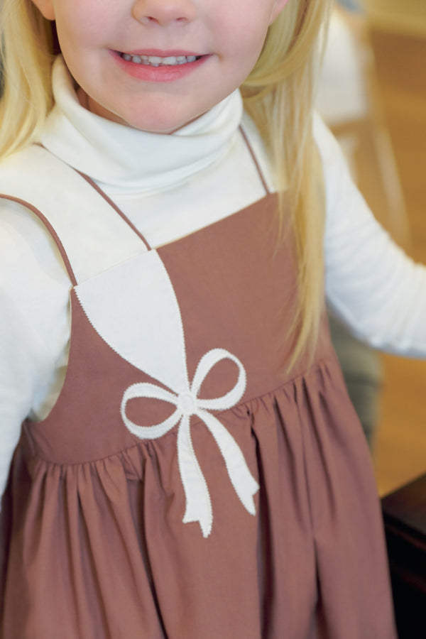Our Demi Dress is a favorite this fall! Featuring Gray Bay Brown with Palmetto Pearl and the sweetest bow embroidery, we're sure every little lady will love this dress!