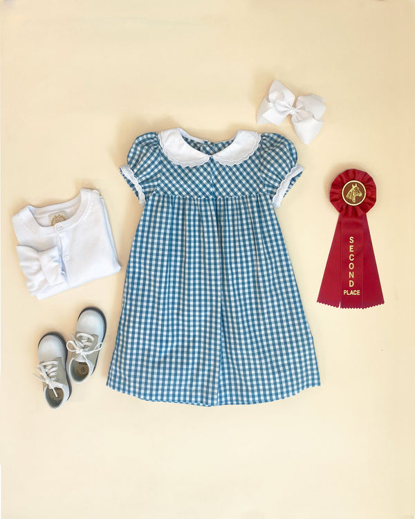 Our Holly Day Dress in Barnsley Blue Gingham with Worth Avenue White is simply adorable! The scalloped detail along the collar and sleeves will have her looking oh so darling for any occasion.