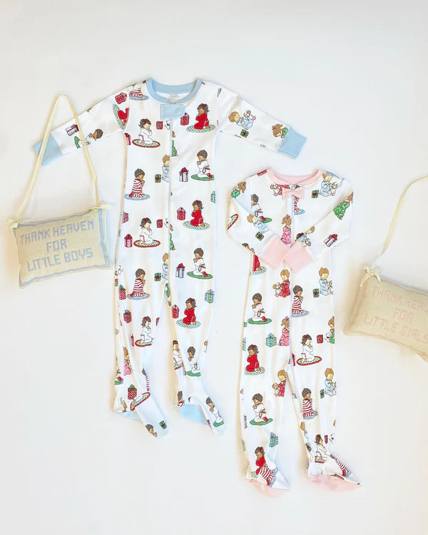 Our Knox's Night Night featuring Holiday Patience and Prayers print brings back one of our most beloved designs from past seasons. Made from Pima Cotton, this pajama features built-in feet and a zip-front closure making it as practical as it is adorable.
