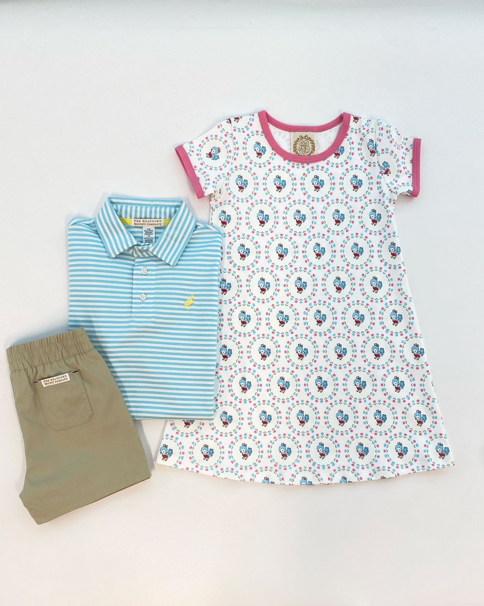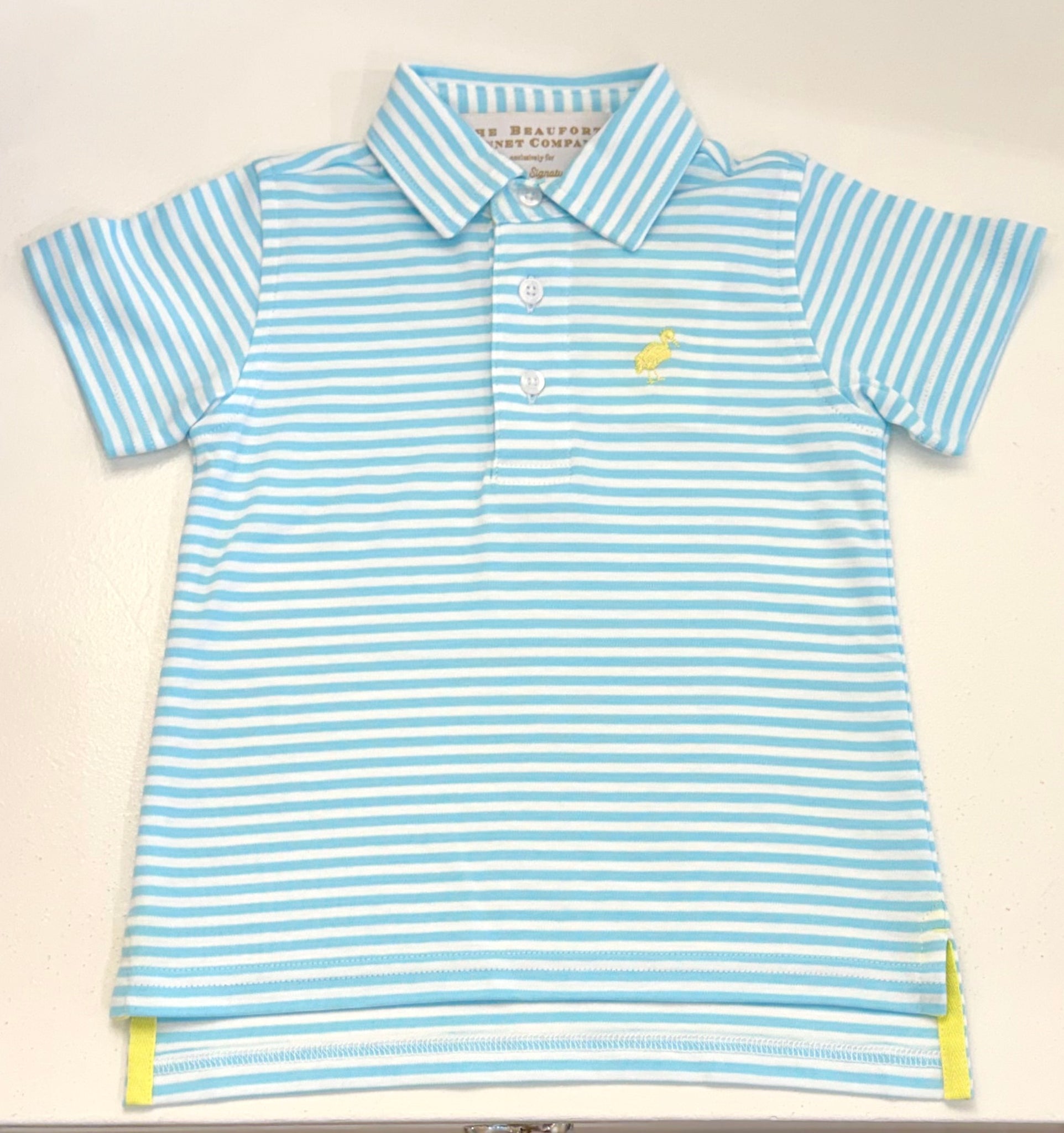 Our Prim & Proper Polo is a wardrobe staple for your little gent! Featuring our signature store exclusive Belhaven Blue Stripe with Lake Worth Yellow stork, this polo was made for hitting the golf course with dad or for any fun fall occasion.