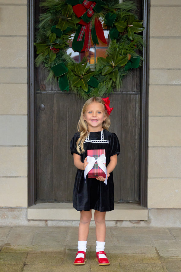 Introducing our Dilly Dress! Featuring Newport Night Velveteen material with puff sleeves and the sweetest ladder eyelet detailing on chest, this dress is the perfect piece to add to her holiday wardrobe.